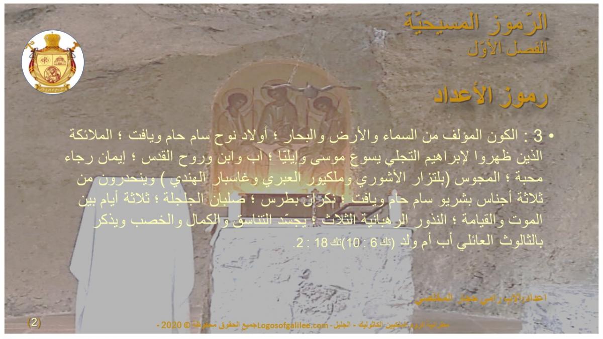 2: يرمز الى الثنائية بمعانيها المزدوجة فهو يمثل الوحدة والإنقسام ؛ التوازن أو النزاع ؛ الصراع بين الخير والشر ؛ الشمس والقمر ؛ الرجل والمرأة ؛ لوحي الوصايا ؛ الوصيتين الكبيرتين ؛ العهدين القديم والجديد... ويعبر عن دينامية الخلق والتدمير (تك 2 : 23-24) (متى 22 : 40)(خر 31 : 18)·