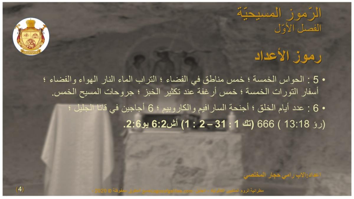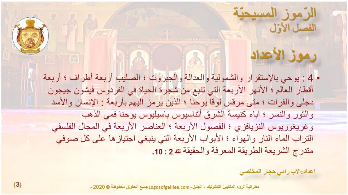 4 : يوحي بالإستقرار والشمولية والعدالة والجبروت ؛ الصليب أربعة أطراف ؛ أربعة أقطار العالم ؛ الأنهر الأربعة التي تنبع من شجرة الحياة في الفردوس فيشون جيجون دجلى والفرات ؛ متى مرقس لوقا يوحنا ؛ الذين يرمز اليهم بأربعة : الإنسان والأسد والثور والنسر ؛ آباء كنيسة الشرق أثناسيوس باسيليوس يوحنا فمي الذهب وغريغوريوس النزيافزي ؛ الفصول الأربعة ؛ العناصر الأربعة في المجال الفلسفي التراب الماء النار والهواء ؛ الأبواب الأربعة التي ينبغي اجتيازها على كل صوفي متدرج الشريعة الطريقة المعرفة والحقيقة تك 2 : 10.