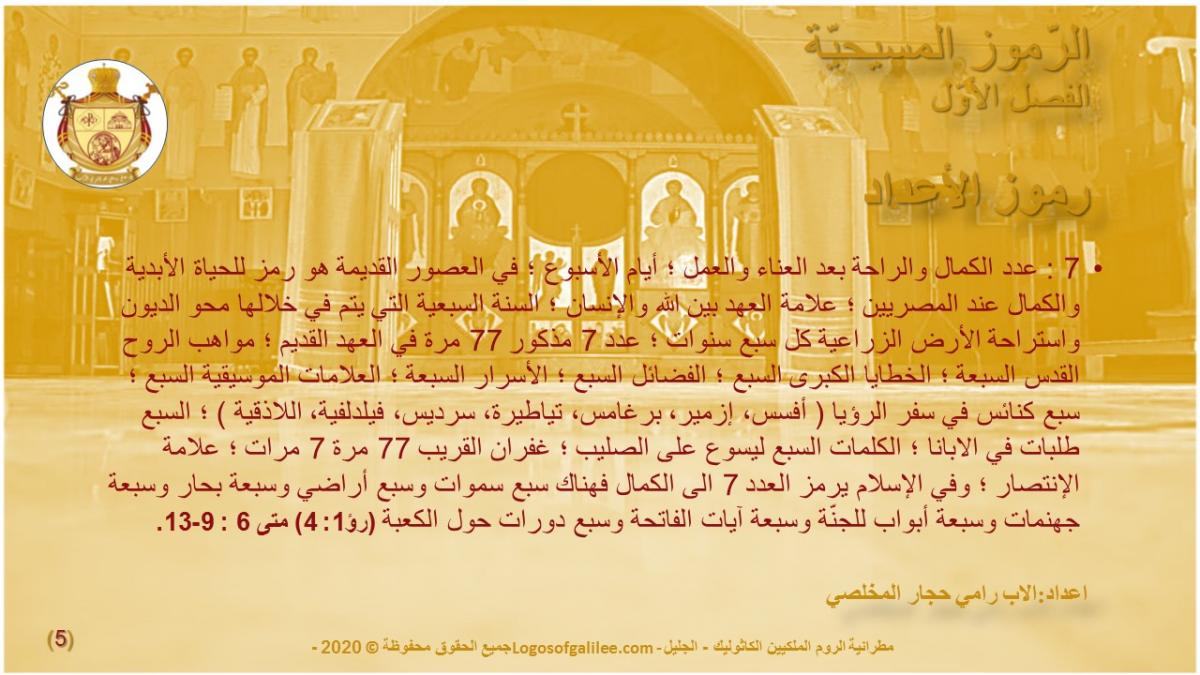 7 : عدد الكمال والراحة بعد العناء والعمل ؛ أيام الأسبوع ؛ في العصور القديمة هو رمز للحياة الأبدية والكمال عند المصريين ؛ علامة العهد بين الله والإنسان ؛ السنة السبعية التي يتم في خلالها محو الديون واستراحة الأرض الزراعية كل سبع سنوات ؛ عدد 7 مذكور 77 مرة في العهد القديم ؛ مواهب الروح القدس السبعة ؛ الخطايا الكبرى السبع ؛ الفضائل السبع ؛ الأسرار السبعة ؛ العلامات الموسيقية السبع ؛ سبع كنائس في سفر الرؤيا ( أفسس، إزمير، برغامس، تياطيرة، سرديس، فيلدلفية، اللاذقية ) ؛ السبع طلبات في الابانا ؛ الكلمات السبع ليسوع على الصليب ؛ غفران القريب 77 مرة 7 مرات ؛ علامة الإنتصار ؛ وفي الإسلام يرمز العدد 7 الى الكمال فهناك سبع سموات وسبع أراضي وسبعة بحار وسبعة جهنمات وسبعة أبواب للجنّة وسبعة آيات الفاتحة وسبع دورات حول الكعبة (رؤ1: 4) متى 6 : 9-13.