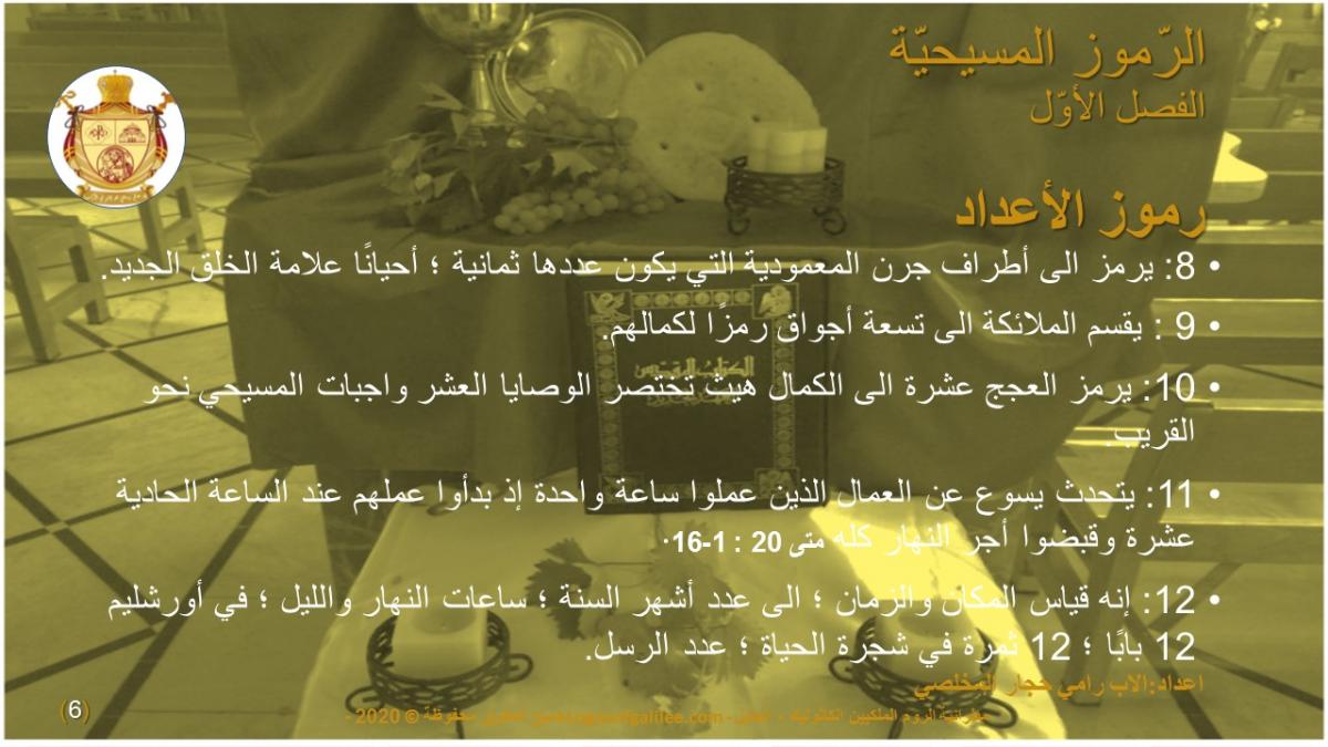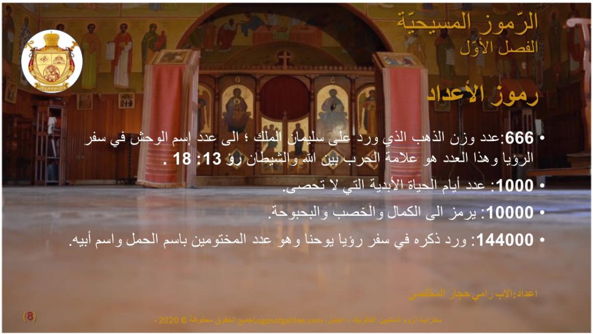8: يرمز الى أطراف جرن المعمودية التي يكون عددها ثمانية ؛ أحيانًا علامة الخلق الجديد.