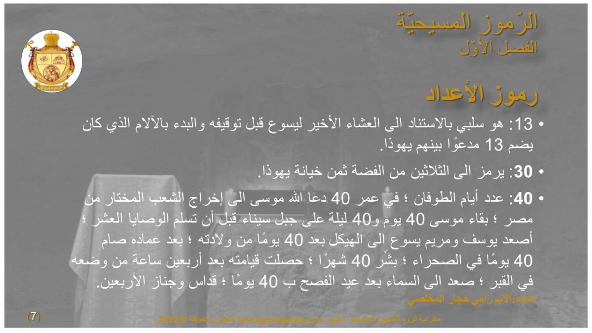 40: عدد أيام الطوفان ؛ في عمر 40 دعا الله موسى الى إخراج الشعب المختار من مصر ؛ بقاء موسى 40 يوم و40 ليلة على جبل سيناء قبل أن تسلم الوصايا العشر ؛ أصعد يوسف ومريم يسوع الى الهيكل بعد 40 يومًا من ولادته ؛ بعد عماده صام 40 يومًا في الصحراء ؛ بشًر 40 شهرًا ؛ حصلت قيامته بعد أربعين ساعة من وضعه في القبر ؛ صعد الى السماء بعد عيد الفصح ب 40 يومًا ؛ قداس وجناز الأربعين.